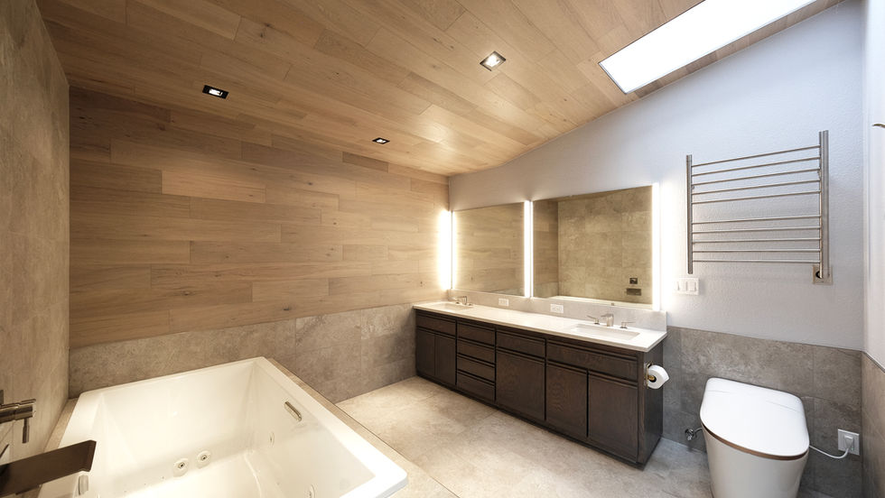 This master bathroom remodel was designed for a couple who loves to travel. They were looking for an elegant space, taking inspiration from interiors of cruise ships. Their goal was to gain more space by removing the large sunken tub and to introduce warmth and light. The existing vaulted ceiling is clad with wood planks that wrap the wall, accentuating the skylight. Porcelain tile wrap the walls to tie the room together, and new LED lights brighten up the space. The shower is made curbless and with a recessed niche. The soffit above the shower is removed to continue the vaulted ceiling. The remodeled space feels spacious and elevated.