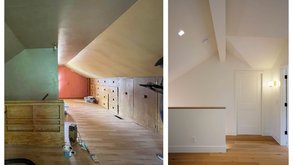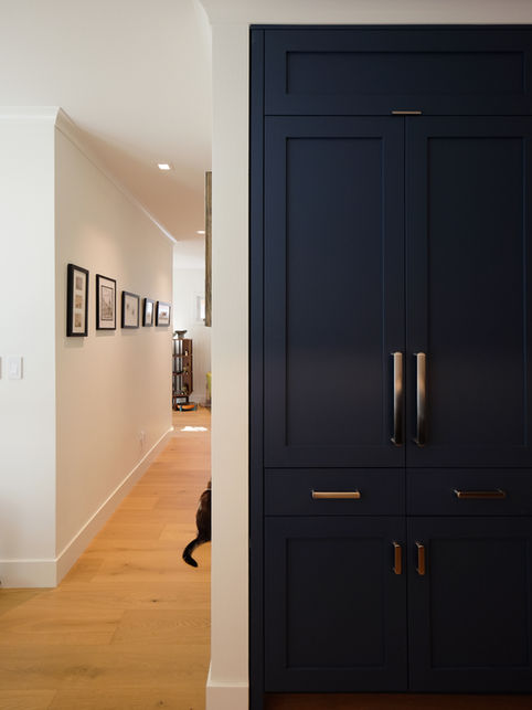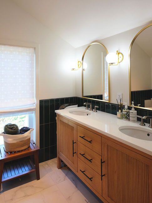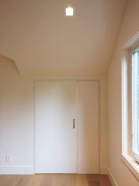 Originally built in 1927, this house has been fully rejuvenated 98 years later. The homeowner, who grew up in this house, wanted to renovate it for herself and her husband. The design incorporates details that echo the home's original character while achieving a simple and clean finish. While most of the house's palette is neutral with warm finishes, there are moments of color throughout the house that bring elegance and vibrancy. On the ground floor, the kitchen, which was previously a separate room, has been opened up into a galley-style kitchen. This design extends the line of sight along the full length of the house. A new foyer was created to provide privacy and a clear transition into the living space. The original fireplace in the living room was converted to a gas fireplace and enhanced with plaster detailing. In the attic, the ceiling was removed to create a vaulted space for the new bedroom and home office. Both spaces are lined with built-in cabinets and closets to maximize storage. A dormer is added in the attic for a primary bathroom with a soaking tub. Meanwhile, the basement was converted to a full guest suite and a finished laundry room. This house, while the original footprint was compact, maximizes its use and provides a new sense of spaciousness.