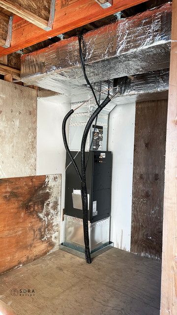 A beautiful morning at the site. HVAC is nearly complete, and sloped roofs are shingled. Electrician is waiting for the flat roof to be installed (we are finding out that it is very tricky during the wet winter season), but the material is there and ready to go.
